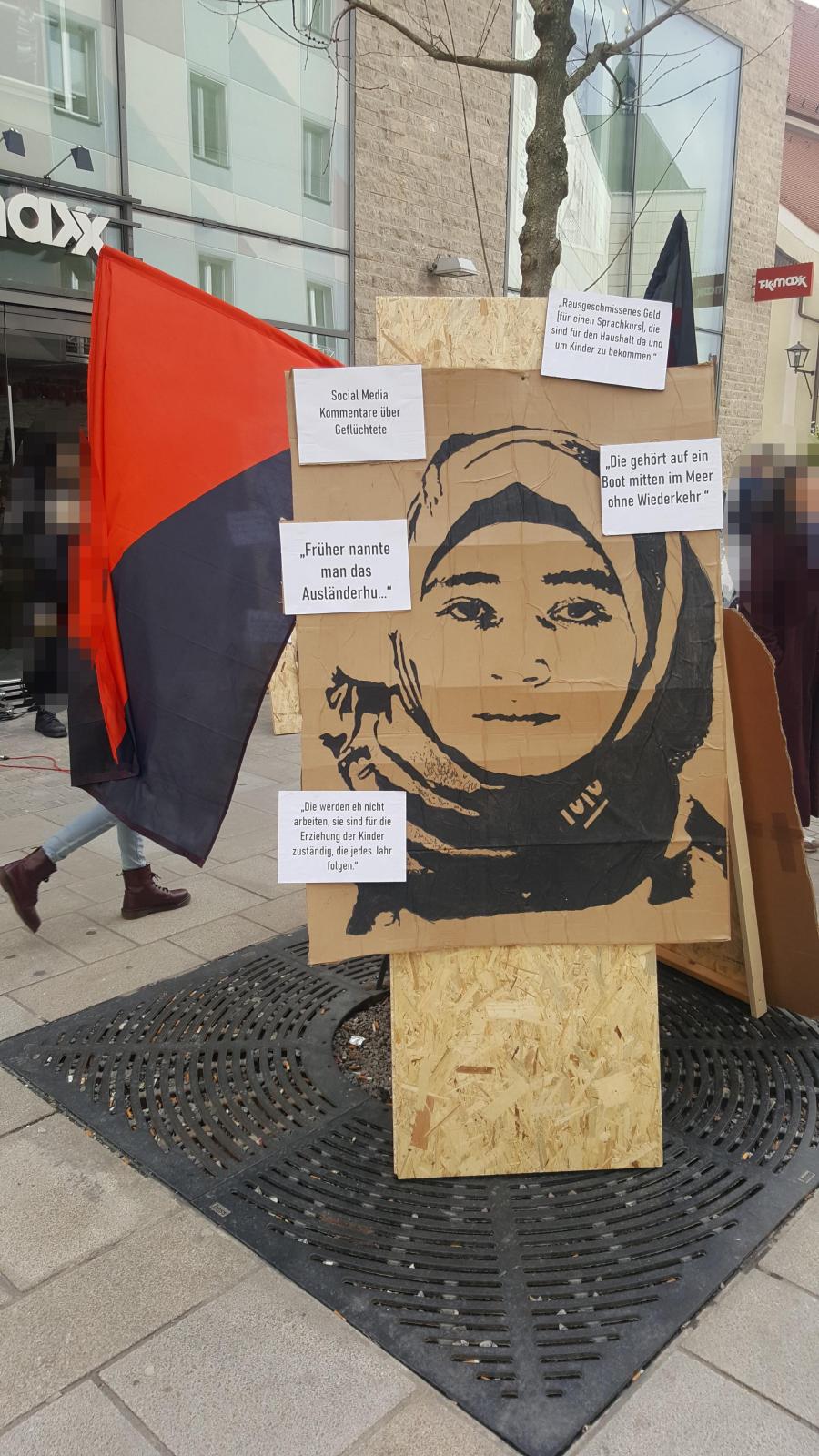 Gestern luden wir zum internationalen Frauen*kampftag die Passant*innen in der Regensburger Innenstadt zur Konfrontation mit den sexistischen Auswüchsen einer patriarchalen Gesellschaft ein. Unserer Gesellschaft. Dank des Künstlers @Gato-M konnten wir diese Ausstellung mit verschieden Einblicken rund um das Thema Alltagssexismus visualisieren. So zeigen die Aufsteller wie Frauen* aus unterschiedlichen Lebensrealitäten Mehrfachdiskriminierungen ausgesetzt werden. Alle angebrachten Kommentare entstammen 1:1 aus sozialen Netzwerken und wurden auch so geäußert. Dies soll unter anderem auch zeigen, wie verbale Gewalt in unserer Gesellschaft ignoriert und toleriert wird. Im Anschluss unterstützten wir gemeinsam die Demonstration gegen patriarchale Gewalt, organisiert von der feministischen Gruppe eben_wiederspruch.